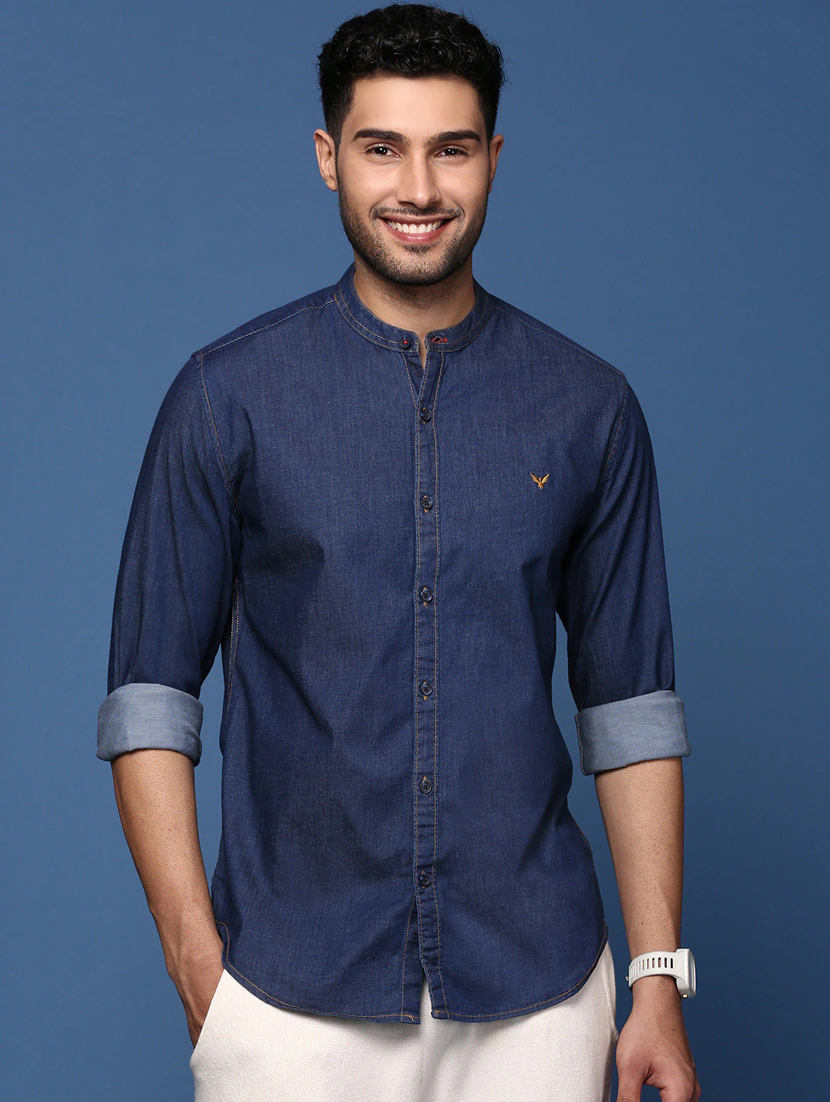 Navy Blue Solid Denim Casual Shirt